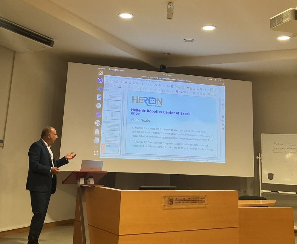 Professor Petros Maragos, Director of HERON, opened the event with a keynote lecture. He presented the scope of tropical geometry and its intersections with the fields of machine learning and computer vision, highlighting its potential applications in Artificial Intelligence and linking these directions to the activities of the HERON Robotics Center of Excellence.