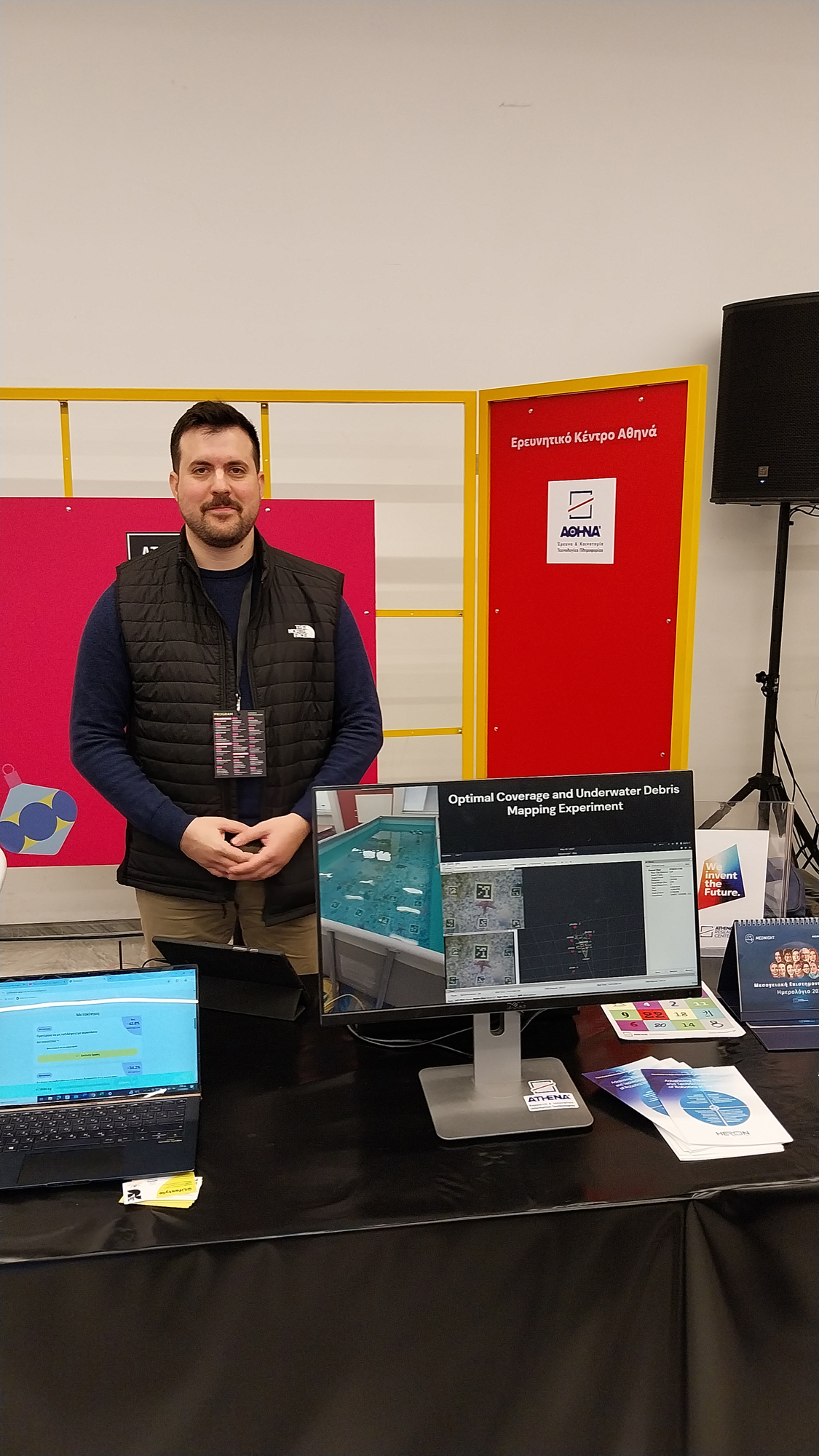 Under the scientific supervision of HERON Senior Researcher Prof. George Karras, researcher Athanasios Gesoulis showcased on Saturday December 20 his ongoing research on Safety and Security Robotics. He presented his work on autonomous detection and collection of marine waste on the seabed with an underwater robotic vehicle equipped with a robotic arm and on autonomous exploration using heterogeneous robotic vehicles and autonomous detection.